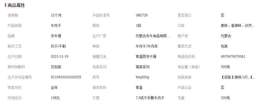 详细信息 商品描述 夯牛情牛肉干 本品为7.5成500克手撕牛肉干, 口味:原味、香辣味、孜然味、混合味 线上线下、商超各大平台均有有控价,各渠道严格执行,支持一件代发 夯牛情内蒙古手撕风干牛肉干散装肉脯辣零食包装特产牛肉真空熟食 |