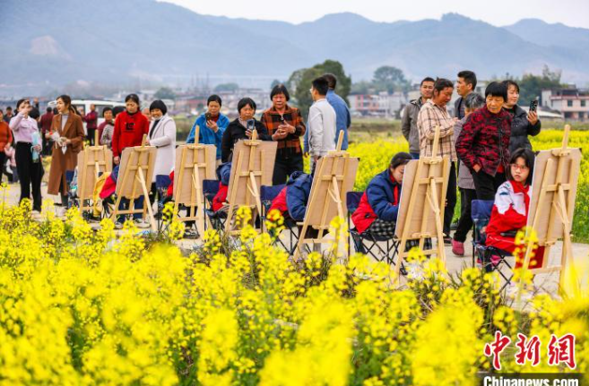 金黄色的花海吸引了不少游客前来踏青赏花游玩,带动了一波火热的乡村游。慕名而来的游客在金色花田里拍照、写生,留下美丽景色。