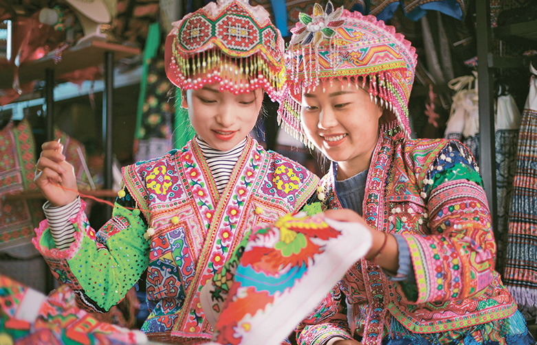 巩固拓展脱贫攻坚成果是全面推进乡村振兴的底线任务。近年来,贵州省黔西市红林彝族苗族乡依托当地丰富的刺绣、蜡染等非物质文化资源,巧用“指尖经济”助力脱贫、推进乡村振兴。图为2023年1月6日,苗族妇女在红林彝族苗族乡渔塘村“刺绣作坊”里刺绣。 人民图片 周训超/摄