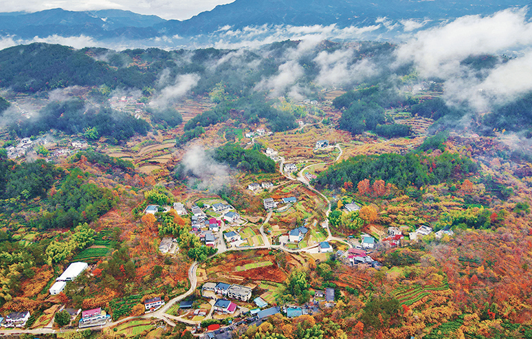 建设宜居宜业和美乡村是农业强国的应有之义。近年来,安徽省安庆市岳西县不断改善山区交通条件,切实推进村容村貌和人居环境整治。图为2022年11月22日,在岳西县天堂镇城南社区,错落有致的民居、通村入户的公路、红绿相间的植被在云雾笼罩下美若画卷。 人民图片 吴均奇/摄