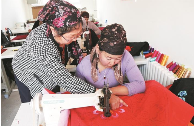 “大家抓紧点,这批绣品顾客要得比较急,质量要求高。”刺绣店经营者左拉汗·阿肯白克像往常一样挨个对绣娘们的手艺进行指导。