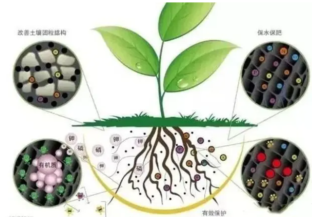 该产品施入土壤后,可以改良、修复土壤,节水保水,补充土壤营养物质,改善土壤生态环境,调节土壤PH值,降解土壤中农药、化肥残留物,降解多种重金属元素,分解土壤中固化及不易被吸收的有机化合物;固氮、解磷、解钾,转化养分,并被植物吸收利用,促进养分循环;有效抑制土壤中的有害菌、致病菌,减少其对植物的危害机会,抑制土壤中的虫卵孵化,有效降低各种病虫害发生;能够提升肥料的利用率,增大其效用,可减少其使用量;具有明显的促进生长效果,能够有效促进作物分化、生长,壮苗壮株,提高植株的生长水平,使作物增产、幅度达到10%-30%;促进植物的光合作用和酶的合成,提高作物营养吸收能力,促进作物生长,提升产物品质,增强作物抗旱、抗寒、抗倒伏、耐涝等能力。