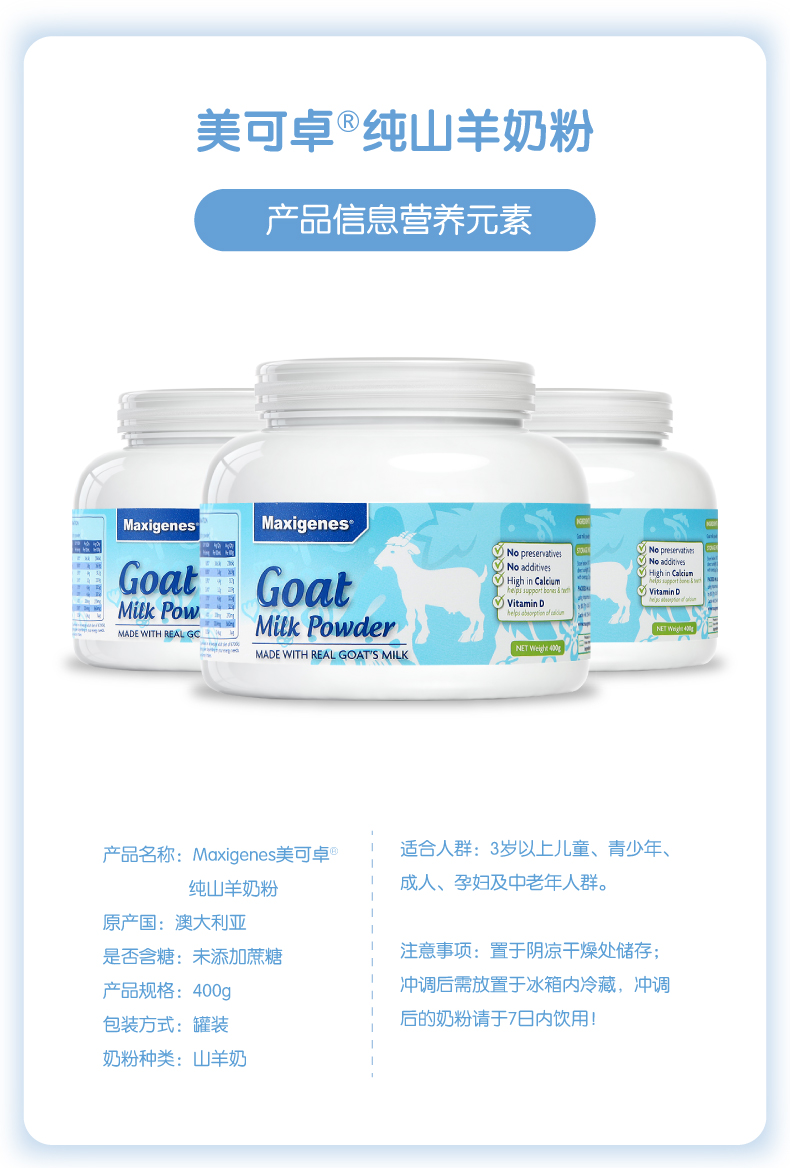 深圳市旗睿优胜国际贸易有限公司发布的澳洲Maxigenes 美可卓纯山羊奶粉成人中老年儿童女士孕妇高钙400g图集库