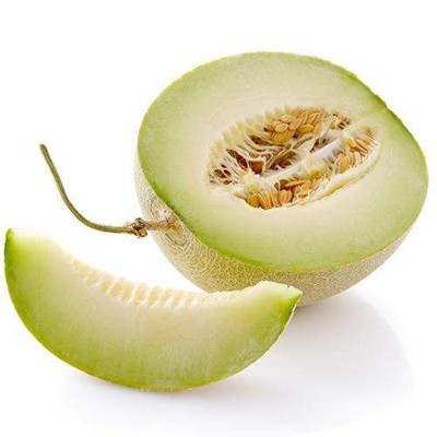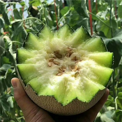 网纹瓜果实呈圆球形,顶部有新鲜绿色果藤;果皮翠绿,带有灰色或黄色条纹,酷似网状,故名网纹瓜;果肉黄绿色或桔红色,口感似香梨,脆甜爽口,散发出清淡怡人的混合香气,有丝丝奶香味和果香味。