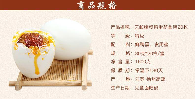 扬州元明食品有限公司发布的云邮牌高邮咸鸭蛋80g*20只红心流油咸鸭蛋宗正熟咸蛋包邮非海鸭蛋图集库